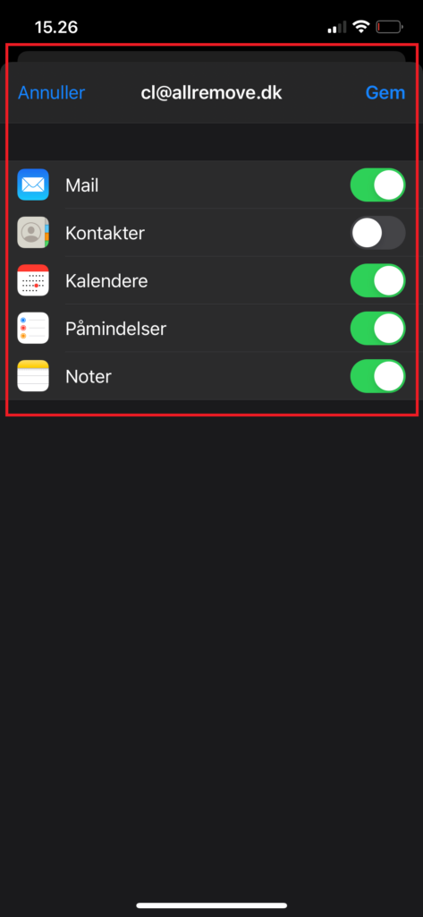 Det virker! Vælg hvad du ønsker at synkronisere fra serveren (som minimum anbefaler vi: Mail, Kontakter, Kalendere)