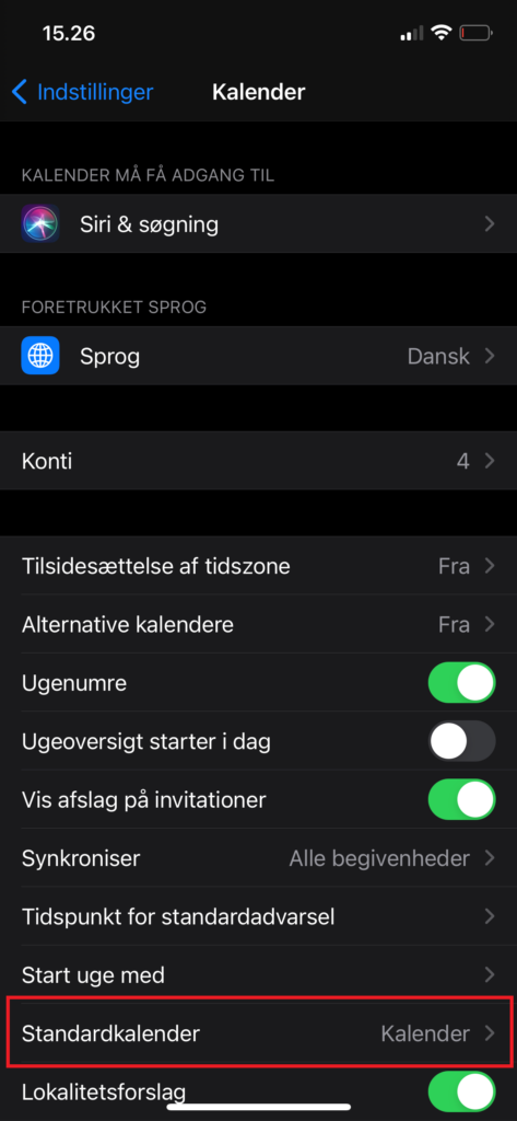 Gå tilbage til starten af “Indstillinger”-appen og vælg “Kalender”-fanen