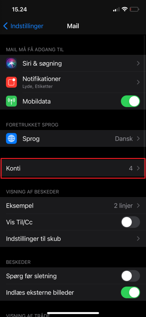 Vælg fanen “konti”. Jeg har på min telefon 4 stk. Dette behøver du ikke nødvendigvis have, så dette tal kan være anderledes