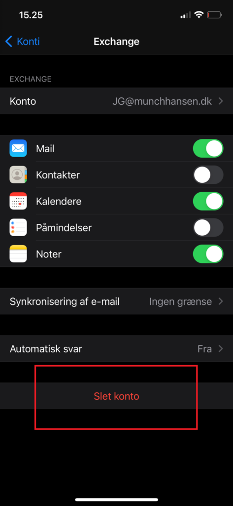 Tryk på “Slet konto” for at slette kontoen, som peger på den gamle server. Du mister ikke noget data ved dette, da alting er blevet kopieret over på den nye konto, så når denne er oprettet, kommer alting tilbage. Herunder mail, kalender, kontakter etc.