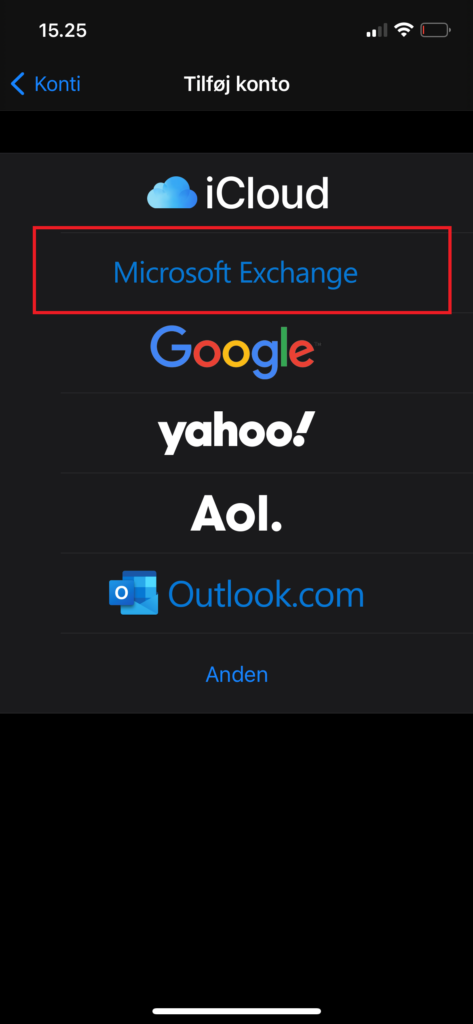 Vælg i listen “Microsoft Exchange” – du skal IKKE vælge Outlook.com (selvom man skulle tro det)