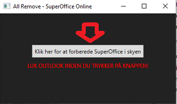 Tryk nu på knappen “Klik her for at forberede SuperOffice i Skyen”. Dette værktøj fjerner den gamle konfiguration og tilføjer en ny til skyen. Når denne er færdig vil det stå i vinduet med hvid tekst. WebTools vil spørge efter login. Login foregår i browseren. Enten logges i ind automatisk eller også vil en All Remove login-side fremkomme hvor i skal bruge jeres fulde mail og kodeord til firmaet for at logge ind.